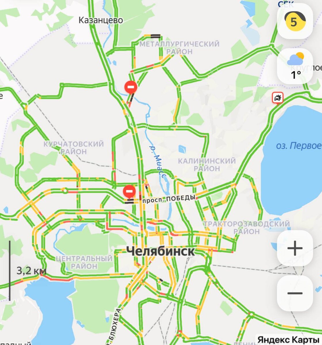 ❤️ Дорожная обстановка и прогноз погоды на сегодня в Челябинске 🚗 Пробки в городе 5 баллов. Движение затруднено на улицах Северо-Крымская, Братьев Кашириных, Университетская Набережная, Энгельса, Худякова, Блюхера, Воровского, Труда и Цвиллинга. ⛔️ Дороги перекрыты на улице Черкасская, Каслинская, Овчинникова и на проспекте Победы. Движение затруднено из-за ДТП на Бродокалмакском тракте. ☁️ Температура воздуха +1°, облачно. #город@chelyabinsk_smi Поддержать Челябинск: проголосовать 👍 Подписаться | Прислать новость