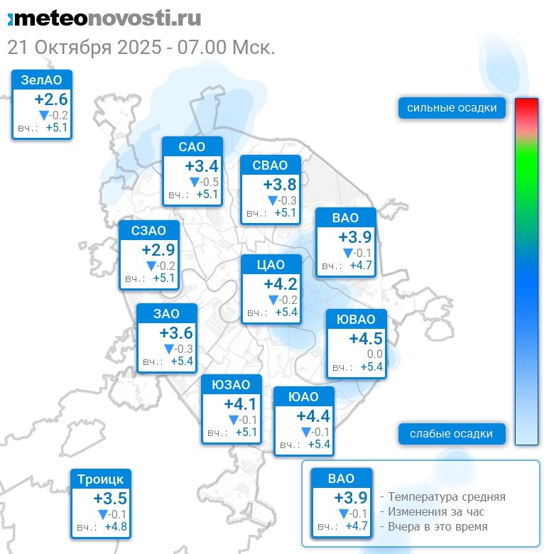 В 7:00 в Москве было от +2.1°C до +4.9°C, средняя температура +3.8°C #погода #Москва #осень #температура #21октября #вторник