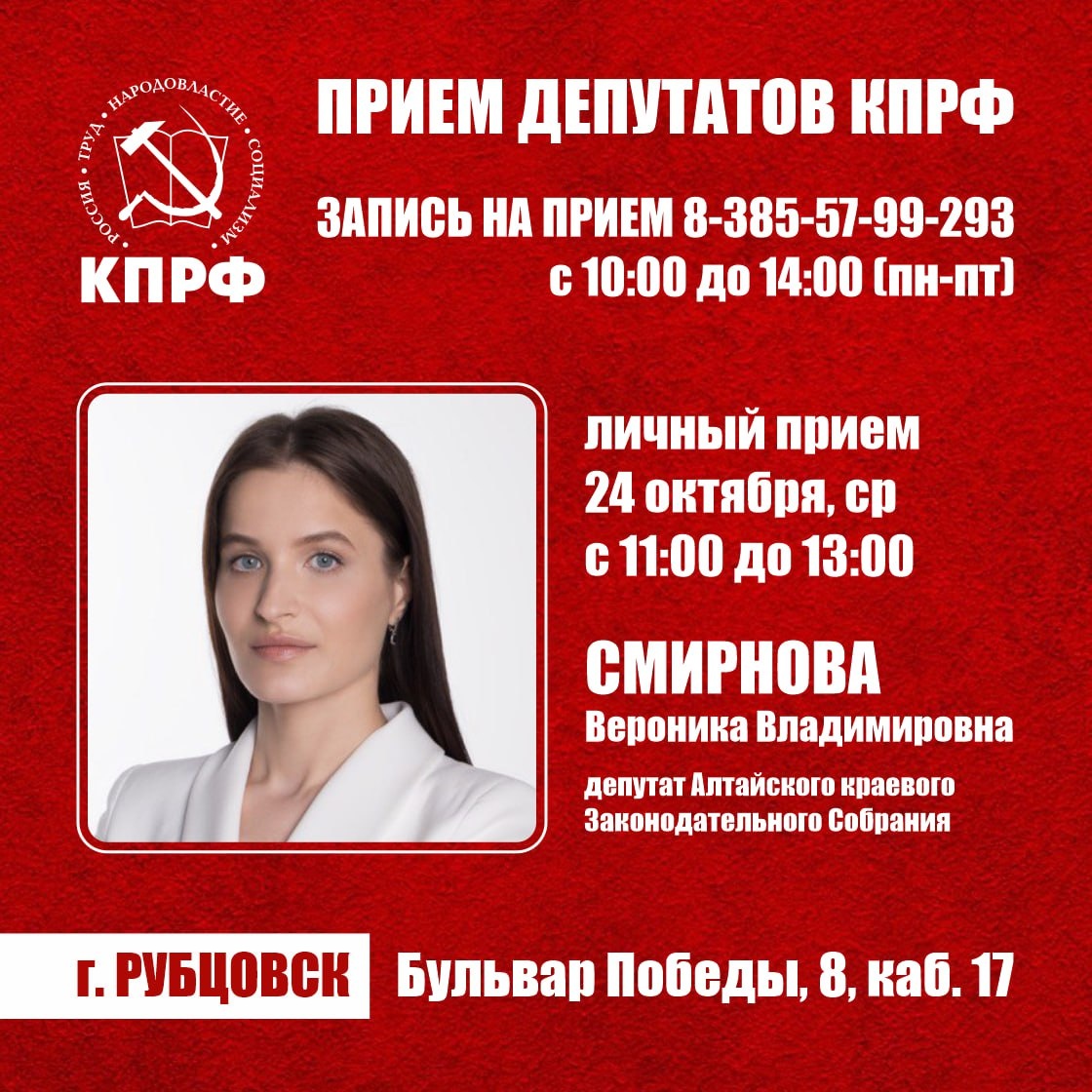 ⚡️Приемные дни депутатов Алтайского краевого Законодательного Собрания по адресу: г. Рубцовск, Бульвар Победы, 8, каб. 17 тел. 8-385-579-92-93 📌24 октября, чт, с 11:00 до 13:00 СМИРНОВА Вероника Владимировна депутат Алтайского краевого Законодательного Собрания