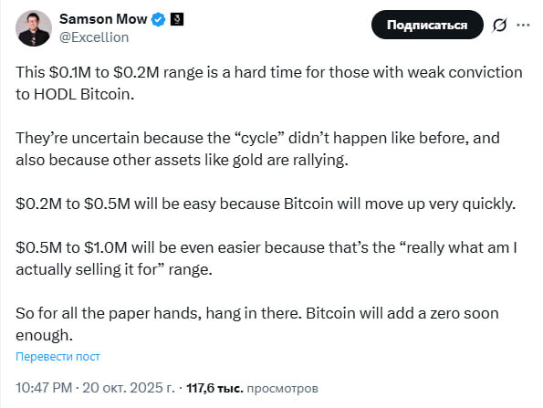 Для слабовольных этот диапазон от $100 000 до $200 000 — самое сложное время, чтобы продолжать удерживать биткоин. Они сомневаются, потому что «цикл» не повторился, как раньше, и потому что другие активы вроде золота тоже растут. А вот с $200 000 до $500 000 будет легко, ведь биткоин начнет быстро двигаться вверх. А с $500 000 до $1 000 000 — еще проще, ведь это уже уровень «зачем мне вообще его продавать?». Так что всем слабым рукам — держитесь. Биткоин скоро добавит нолик.