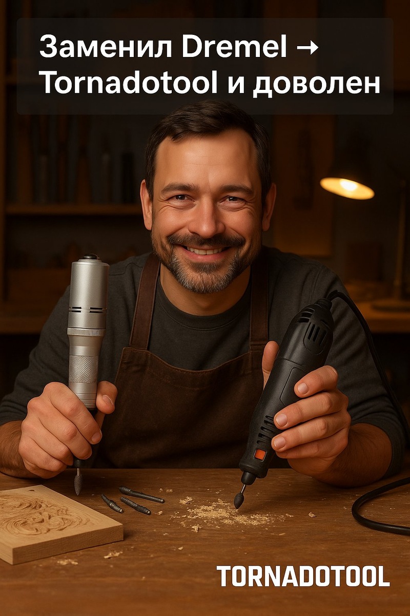 Отзыв мастера: заменил Dremel на Tornadotool — и забыл о проблемах 🪵 “После Dremel я думал, что все граверы одинаковые. Tornadotool оказался другим уровнем — работает тише, мощнее и не греется.” 🔹 Dremel — 15 минут и перегрев. 🔹 Tornadotool — час без остановки. 🔹 Корпус металлический, биение минимальное. 💡 Когда инструмент создан мастерами — это чувствуется сразу.