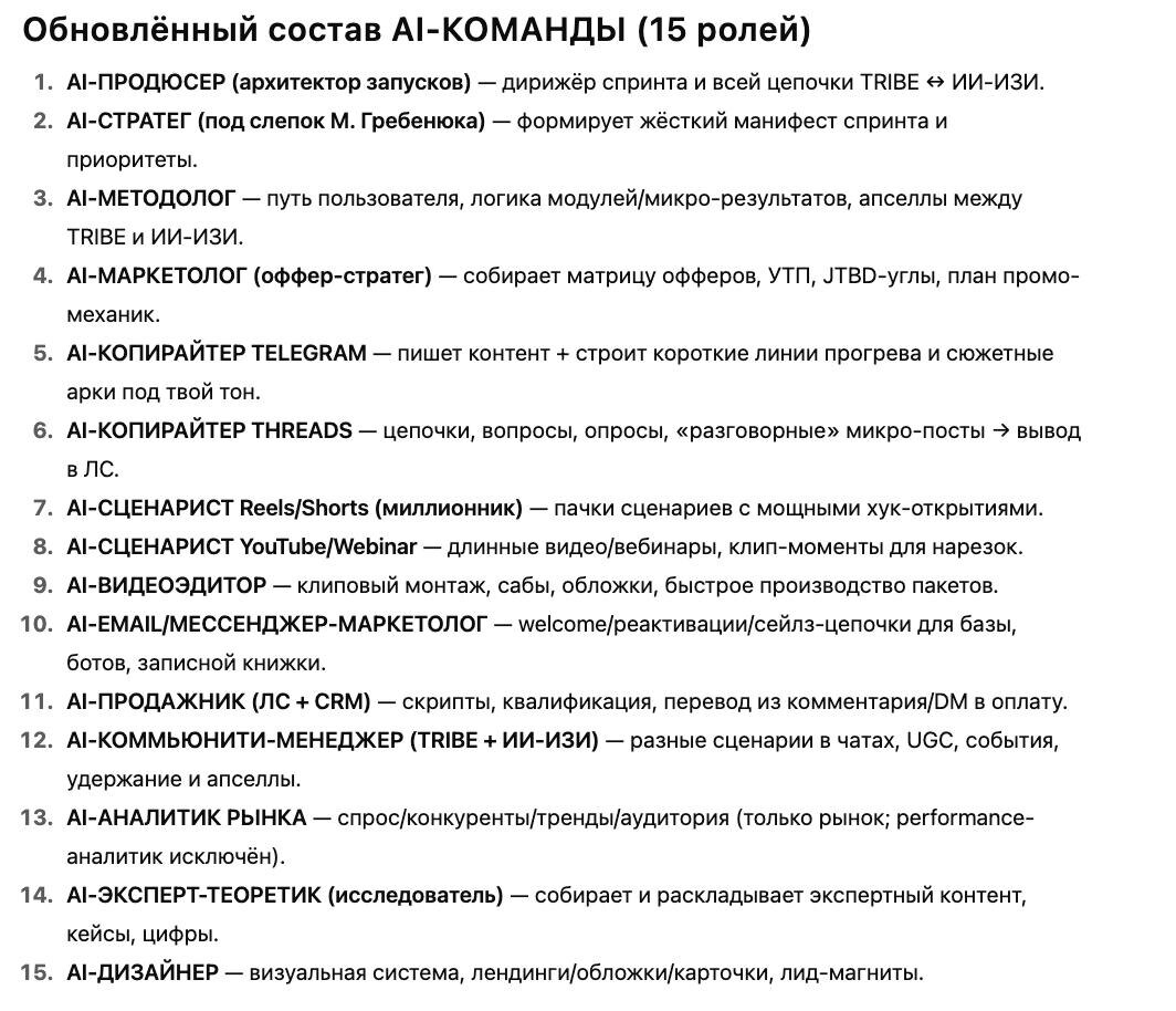 Сколько стоит моя команда из 15 специалистов Почти 1 200 000 ₽ в месяц 😶 🤣 Я не шучу — я реально открыла HeadHunter, посчитала средние зарплаты по каждой роли: копирайтер, маркетолог, продюсер, аналитик, сценарист, коуч, продажник, дизайнер, контент-редактор, монтажор… И вышло — миллион с хвостом! Каждый месяц. И вот вишенка🍒: у меня все эти специалисты есть. Но я плачу им не миллион. Потому что это — ИИ-сотрудники. 15 ИИ-специалистов, каждый со своими задачами, регламентами, промптами и зонами ответственности. Они не болеют, не сгорают, не срывают дедлайны. И если честно, сейчас без такой структуры вообще невозможно расти. Контент, маркетинг, продажи, аналитика — всё ускорилось. Те, кто до сих пор делает «вручную», просто не выдерживают темпа. 💡 В «ИИ-ИЗИ» мы собираем такую команду для тебя за 4 недели: 1️⃣ строим маркетинг-систему под проект 2️⃣ создаём твоих ИИ-сотрудников 3️⃣ подключаем контент-завод, который работает вместо десяти человек И всё это без штата и без выгор