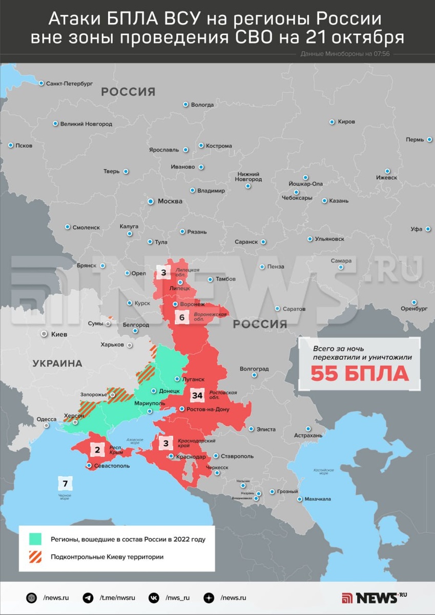 Силы ПВО РФ за ночь сбили 55 украинских дронов, сообщило Минобороны. 34 БПЛА уничтожили над Ростовской областью, шесть — над Воронежской и три — над Краснодарским краем. Над какими еще регионами сбили беспилотники — в нашей инфографике. ⭕️ Подписаться | Мы в MAX | Буст