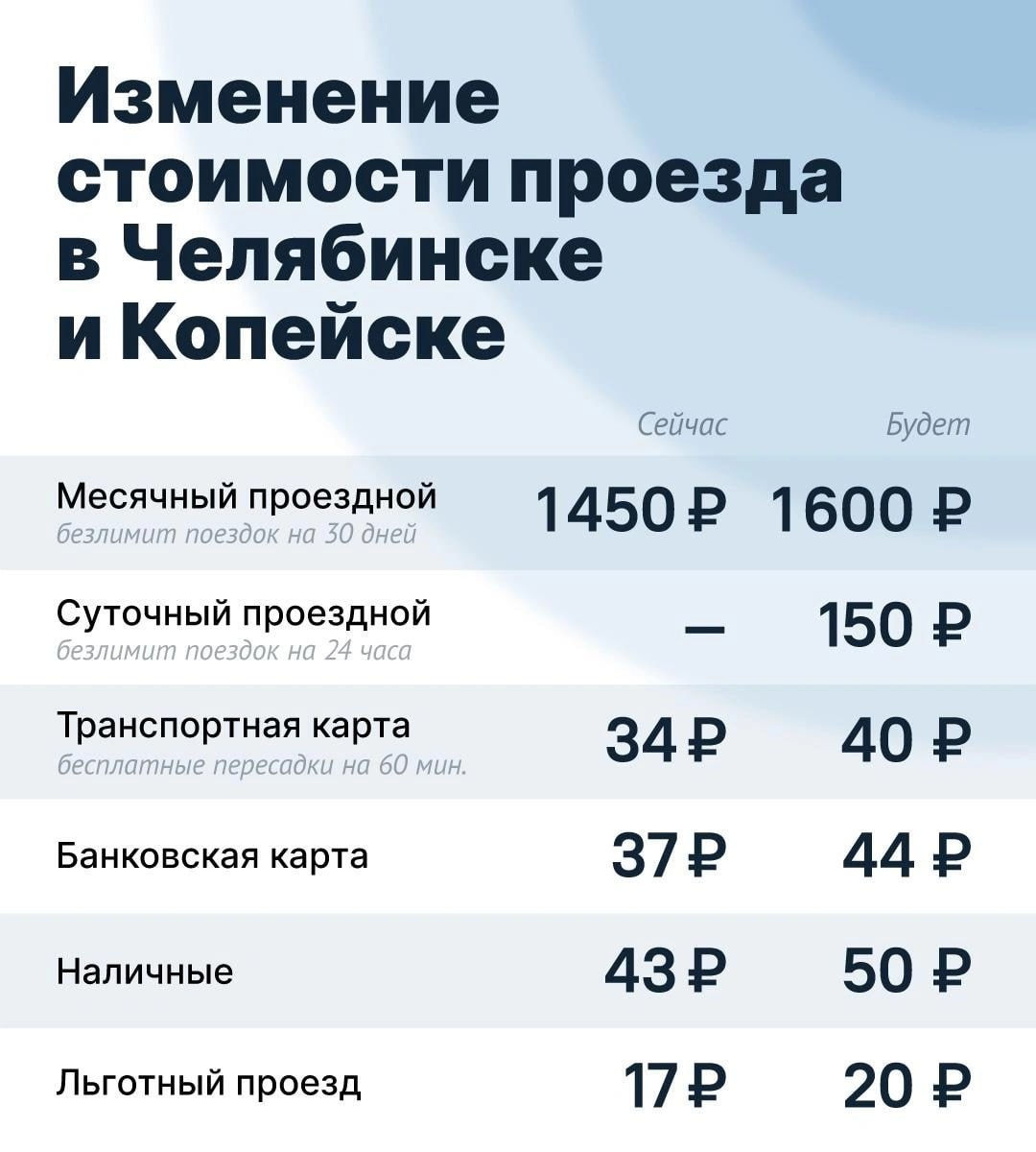 В общественном транспорте с 1 ноября повысят стоимость проезда Это коснется как городских, так и пригородных маршрутов, сообщают в Миндортрансе. Причина — поддержание высокого уровня работы транспорта и решение проблемы нехватки кадров. Теперь проезд по банковской карте будет стоит 44 рубля (вместо 37 руб.), за наличку — 50 рублей (вместо 43 руб.). По транспортной карте поездка будет стоить 40 рублей (вместо 34 руб.), проездной подорожает с 1450 до 1600 рублей. Льготный разовый проезд будет обходиться в 20 рублей (вместо 17 руб.). Введут новый тариф — суточный безлимитный проездной, который будет стоить 150 рублей. На пригородных маршрутах, которые связывают Челябинск, Копейск и Сосновский округ, по транспортной и банковской карте билет будет стоить 50 рублей вместо 43 руб. За наличку проезд подорожает с 48 до 55 рублей. В ведомстве добавили, что проездные на месяц станут выгоднее — теперь их стоимость рассчитывают исходя из 40 поездок, а не из 44. Теперь проездной можно будет запи