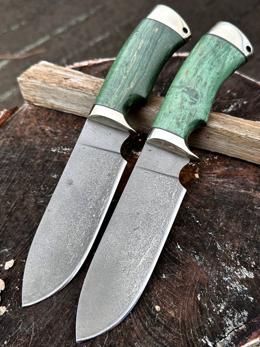 — Анатомическая рукоять из стабилизированной зелёной карельской берёзы и мельхиора — удобно ложится в руку, не скользит
