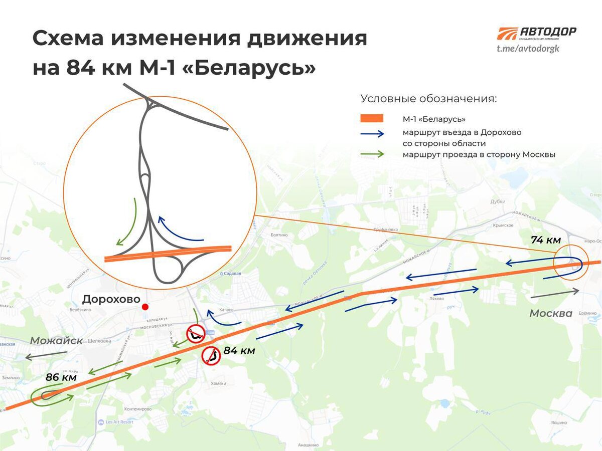 С 20 октября на 84 км введена временная схема движения на трассе М-1 «Беларусь» Закрыт левый поворот: • С трассы М-1 на дорогу А-108 (в сторону Дорохово). • С дороги А-108 на М-1 в сторону Москвы. Как правильно проехать: Если нужно с М-1 на А-108 (со стороны области): ехать прямо до развязки на 74 км, выполнить разворот и двигаться обратно до нужного съезда. Если нужно с А-108 на М-1 в сторону Москвы: двигайтесь по трассе в сторону области до разворотной петли на 87 км, развернитесь и следуйте в нужном направлении.