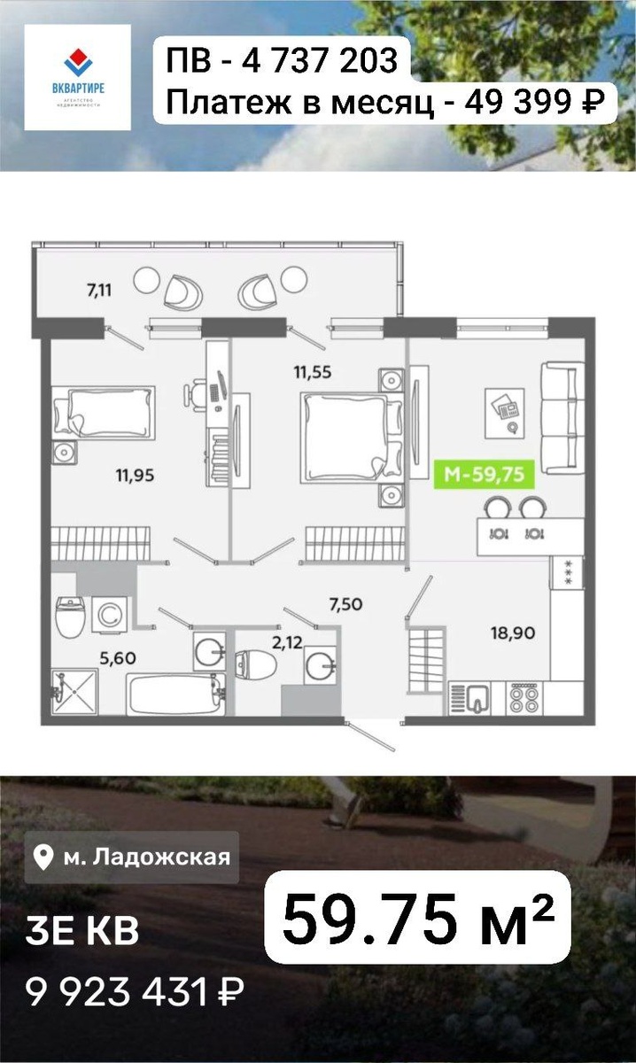 Кейс Всеволожский р-н, ЛО 🌆🚗 Ладожская, 10 минут транспортом 🚌⭐ Расчёт стоимости по семейной ипотеке от застройщика: Стоимость квартиры - 15 738 214₽ 🏢 ПВ - 4 737 203₽ 💸 Платеж в месяц - 49 399₽ 🔄 Ставка - 3.5 % 📈 Срок, лет - 30 🌟 Описание объекта Жилой комплекс возводится в пос. Янино - в одном из самых перспективных мест для жизни. 🌲🚗 Локация позволяет в считанные минуты добираться на автомобиле до города, а близость к природе – наслаждаться прогулками на свежем воздухе. 🌳🚵♂️ Преимущества 🚙 Удобный выезд на КАД 📦 Сплошное остекление балконов и лоджий 🚢 Малошумные современные лифты 🧳 Есть сити-боксы 🔒 Закрытая территория 💡 Система умный дом 🌿 Уютные зелёные дворы 🛋️ Колясочные в каждой парадной 👉 Класс энергосбережения A 🔇 Дополнительная шумоизоляция 🪜 Безбарьерная среда 🌀 Клапаны индивидуальной вентиляции 🐶 Площадка для выгула собак 📷 Видеонаблюдение Заинтересовали? Узнать подробнее вы можете на бесплатной консультации @Podborka_VkvartireBot