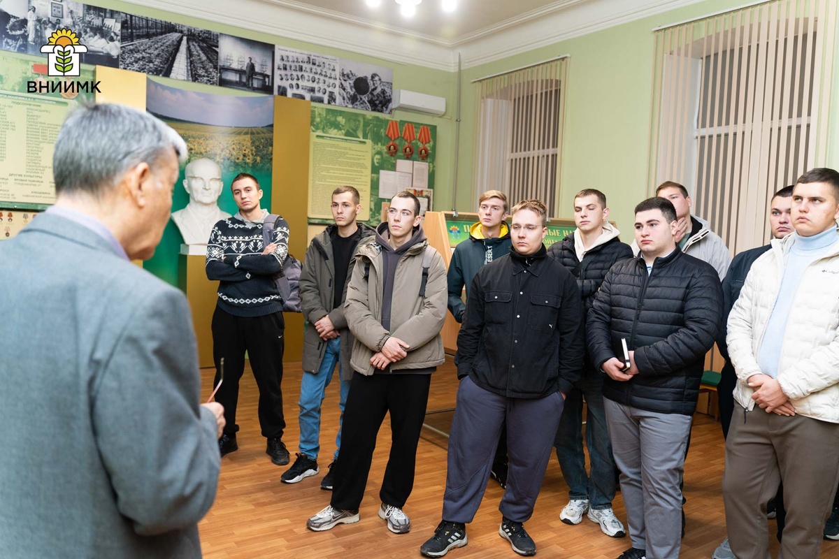 ВНИИМК открыл двери для студентов первого курса факультета агрономии и экологии. Ученые Центра провели для будущих агрономов экскурсию и лекции. Главный эксперт сектора координации научно-исследовательских работ ВНИИМК Николай Иванович Бочкарев пригласил студентов в музей истории центра, где собрана уникальная коллекция фотографий, рукописей, материалов, личных вещей Василия Степановича Пустовойта и ученых, внесших особый вклад в аграрную науку. На лекции у заведующего агротехнологическим отделом Александра Сергеевича Бушнева студенты узнали об особенностях технологии выращивания подсолнечника, его биологических особенностях, современных тенденциях в области селекции, направленных на решение одной из важнейших на сегодня задач по созданию сортов и гибридов, устойчивых к дефициту влаги. Старший научный сотрудник лаборатории агротехники Юлия Викторовна Мамырко рассказала студентам об истории масличного льна, его хозяйственном значении, новинках в селекции и о том, как его выращивать, что