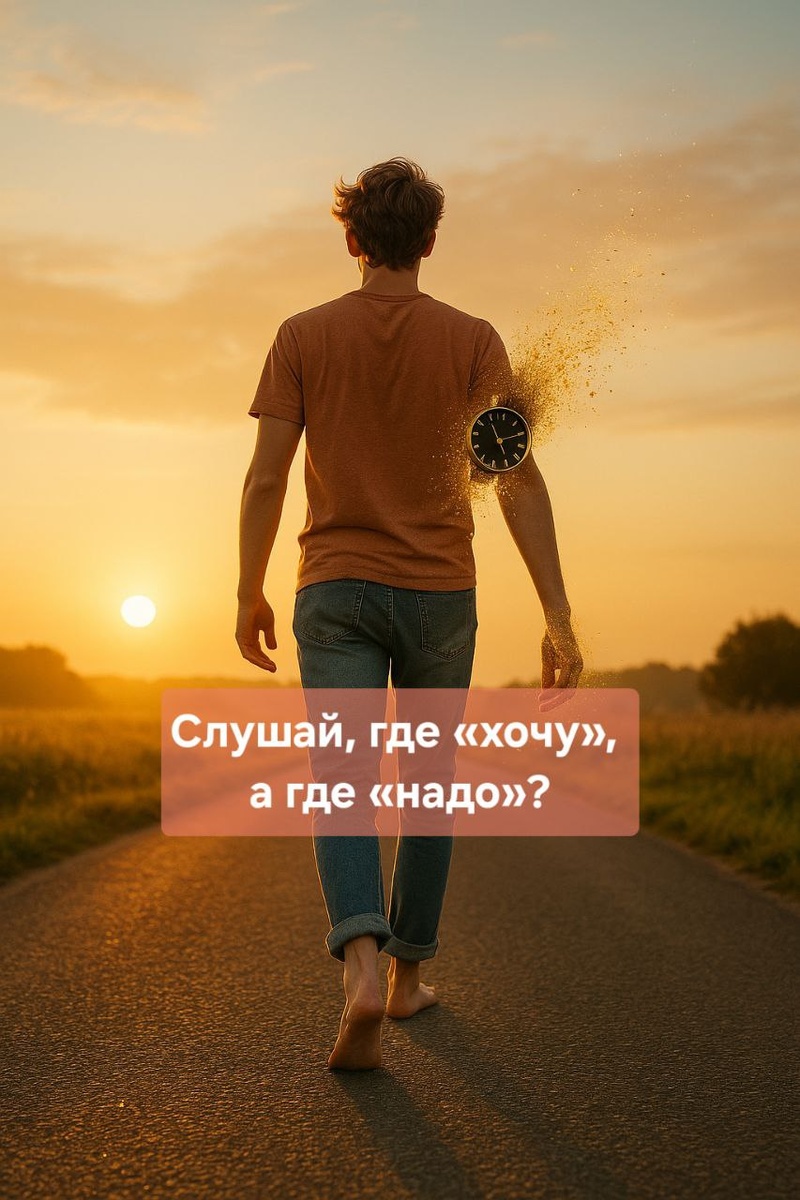 ▶️Свобода от часов. Жить без спешки — не значит валяться и ничего не делать. Это значит делать из отклика, а не из страха. План — хорошо. Но пусть он будет как маршрут на карте, а не как наручники. Ты же не ругаешь реку за то, что она не течёт по прямой? 👉 Попробуй завтра: Не планировать каждую минуту. А просто слушать — где внутри «хочу», а где «надо». Иногда они совпадают — и это лучше любого тайм-менеджмента. 👉 Вопрос: Где я живу по часам, а не по отклику? (работа, отношения, отдых, тело, всё перечисленное 😅) И где я готов(а) поменять сценарий?