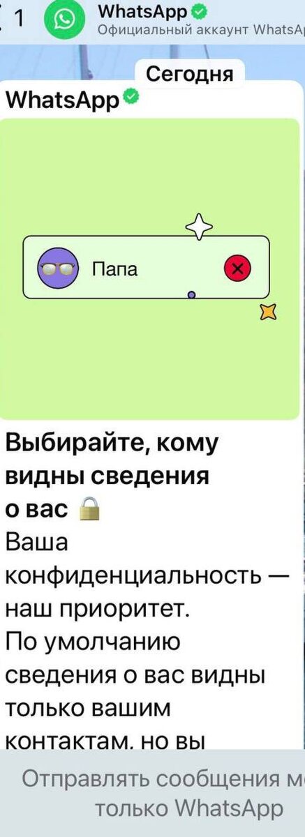 Открываю рубрику «Всё неспроста» Новый тул в Вотсап - теперь можно скрывать данные от выбранных Контактов. И , как пример, в рассылке WhatsApp показано,как скрыть данные от контакта папа Ломаем традиционные ценности ? Подсказываем ДЕТЯМ и ПОДРОСТКАМ, что надо скрывать данные от родителей? Логично, так будет выгодно бизнесу и политикам. Нашими детьми и взрослыми неокрепшими умами будет руководить кто-то другой , не родители и не друзья . #вотсап #whatsapp #молодёжь 🔽 🔽 🔽 Перфекционисты любых взглядов, присоединяйтесь! ↪️ https://t.me/DoctrinesA