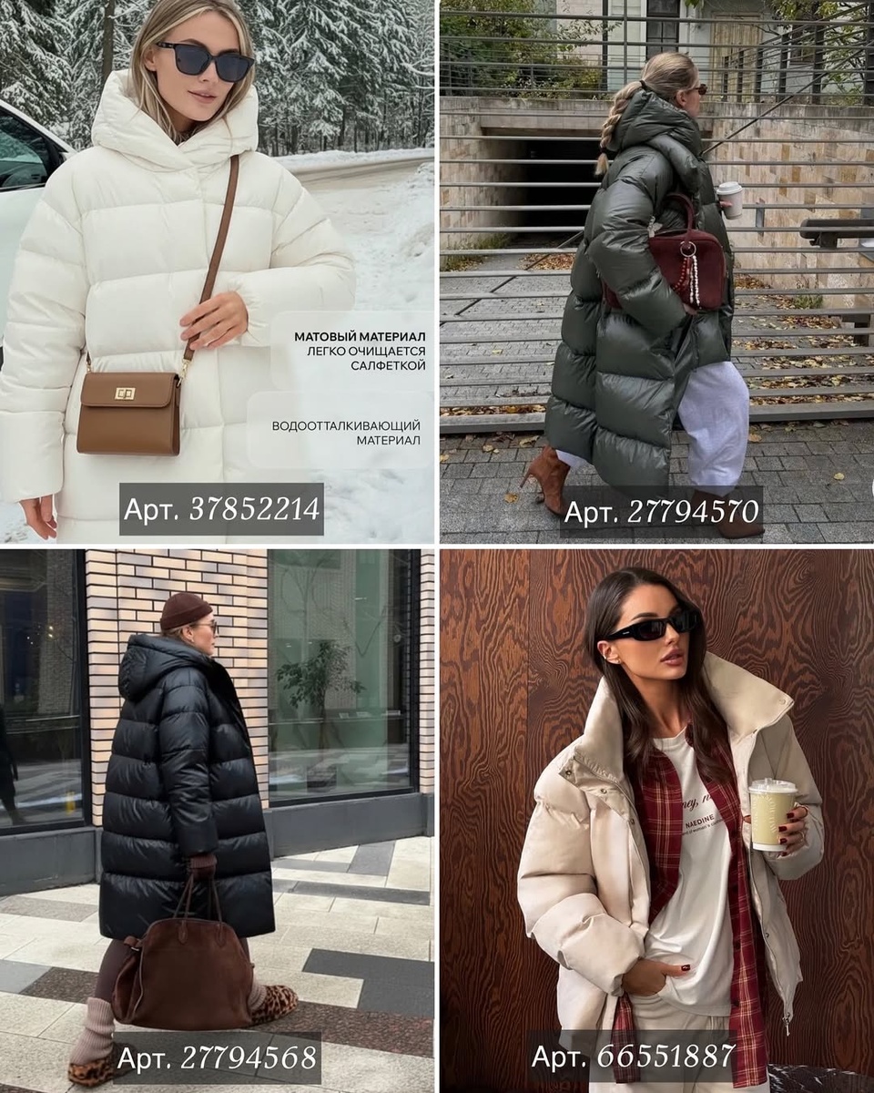 Зима — время, когда стиль и уют обязаны идти рука об руку. Я собрала для вас подборку пуховиков и дутиков с безупречными пропорциями, красивыми оттенками и продуманными деталями. Ниже — подробные разборы каждой модели, советы по посадке и сочетаниям. Идём строго по порядку, как на фото. Арт. 37852214 Молочный укороченный пуховик, матовая ткань Лаконичная «объёмная подушка» без лишних швов и блеска. Материал матовый, водоотталкивающий — следы от снега и капель легко убрать салфеткой. Тёплый высокий капюшон заменяет шарф, а прямой низ красиво ложится поверх джинсов, трикотажных брюк и мини-юбок с плотными колготами. Совет стилиста. Молочный оттенок лучше всего «оживлять» контрастными аксессуарами: шоколадная сумка, тёмные очки, грубые ботинки. Если рост невысокий — подбирайте брюки и обувь в одном тоне, чтобы вытянуть силуэт. Арт. 27794570 Длинный пуховик цвет «болотный металлик» Утеплённый до пят «кокон» с лёгким глянцем и крупной простёжкой. По бокам — разрезы на кнопках для свободы ш