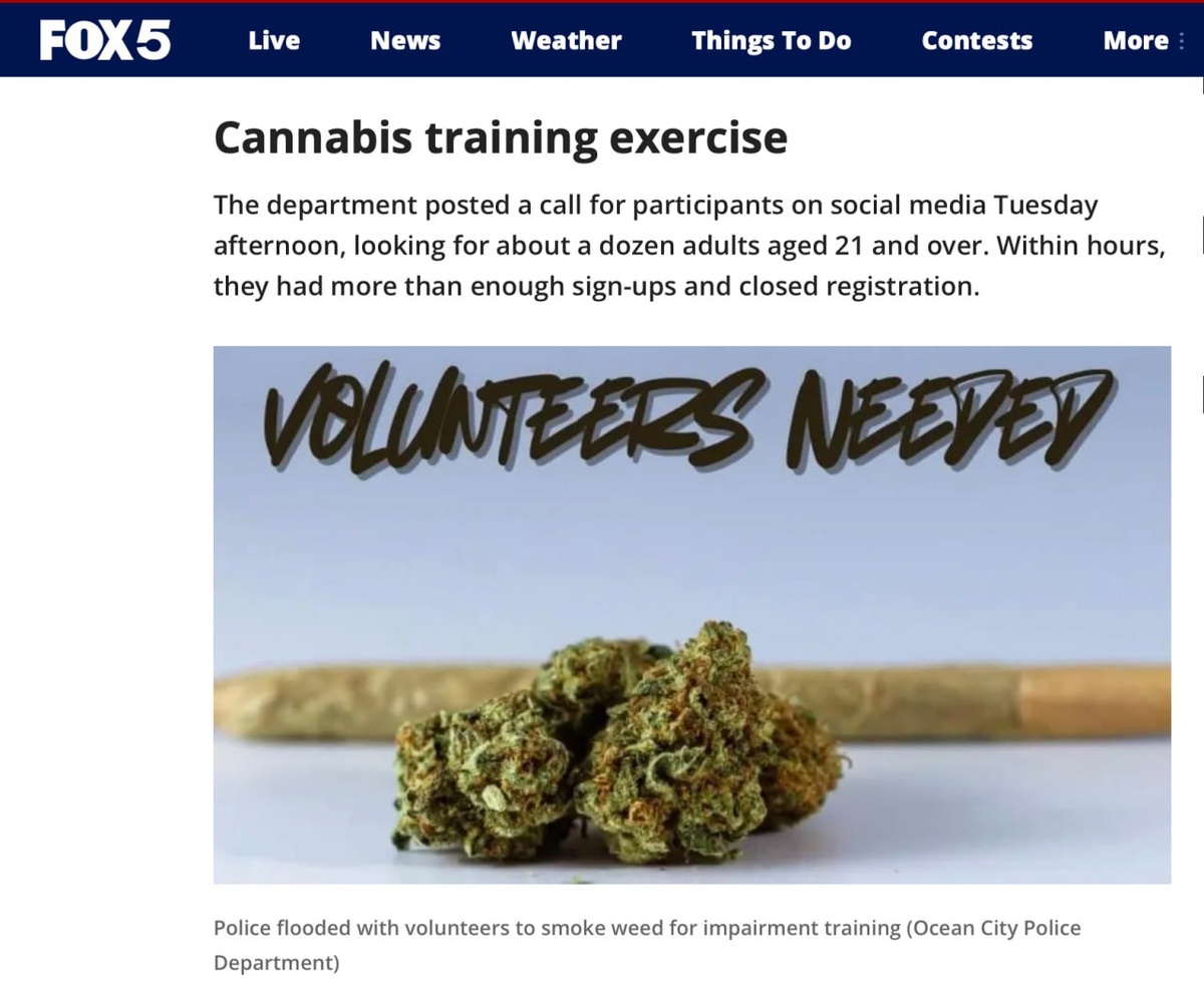Полиция Мэриленда ищет добровольцев… покурить и покататься за рулём. Нужно 12–14 человек с лёгким отношением к жизни и косяку. Цель — помочь копам научиться отличать водителя от летающего голландца под каннабисом. Обучение полицейских, смерть здравому смыслу. Теперь за езду в хлам платят не штраф, а в меню — участие в официальном тренинге.