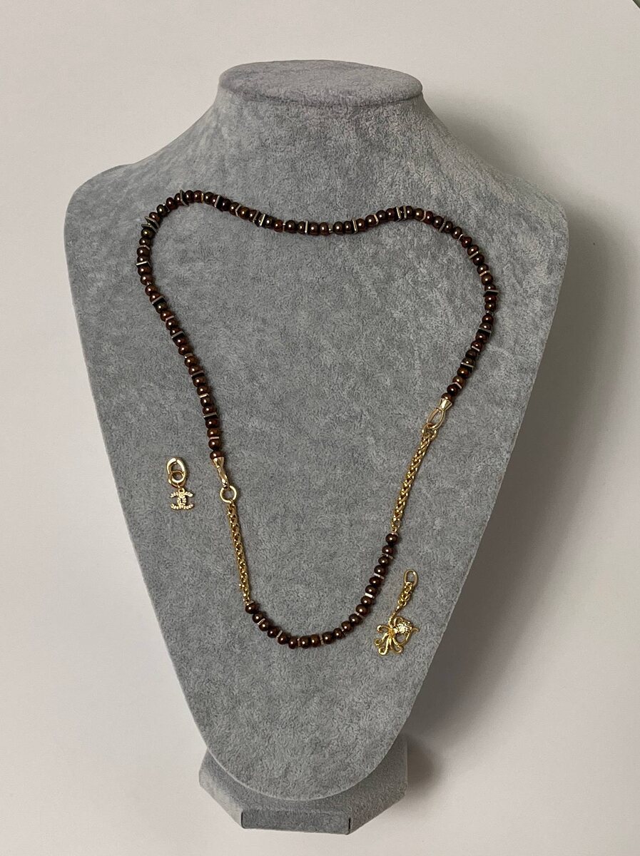 Натуральный пресноводный жемчуг глубокого шоколадного оттенка, позолоченные акценты и возможность носить как браслет и чокер или колье.