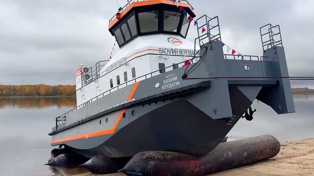 Череповецкий судостроительный завод (ЧСЗ) спустил на воду новый мощный буксир-толкач. Судно построено для Государственной транспортной лизинговой компании (ГТЛК). Этот красавец, названный «Василий Верещагин», — один из пяти однотипных буксиров проекта ТСК.395, которые ГТЛК заказала у завода. Их поставка запланирована на конец этого года. Буксиры спроектированы конструкторским бюро «Речфлот» так, чтобы уверенно чувствовать себя во льдах. Усиленный корпус позволяет им ходить по битому льду толщиной до 30 см. При длине в 22 метра и ширине в 7,5 метров, буксир имеет осадку всего 1,5 метра, что идеально для рек. Два дизельных двигателя мощностью 440 кВт обеспечивают рабочую скорость чуть более девяти узлов и максимальную автономность в 108 часов, что позволяет буксиру совершать практически непрерывные рейсы из пункта А в пункт Б, толкая или буксируя баржи даже в условиях мягкой зимы.