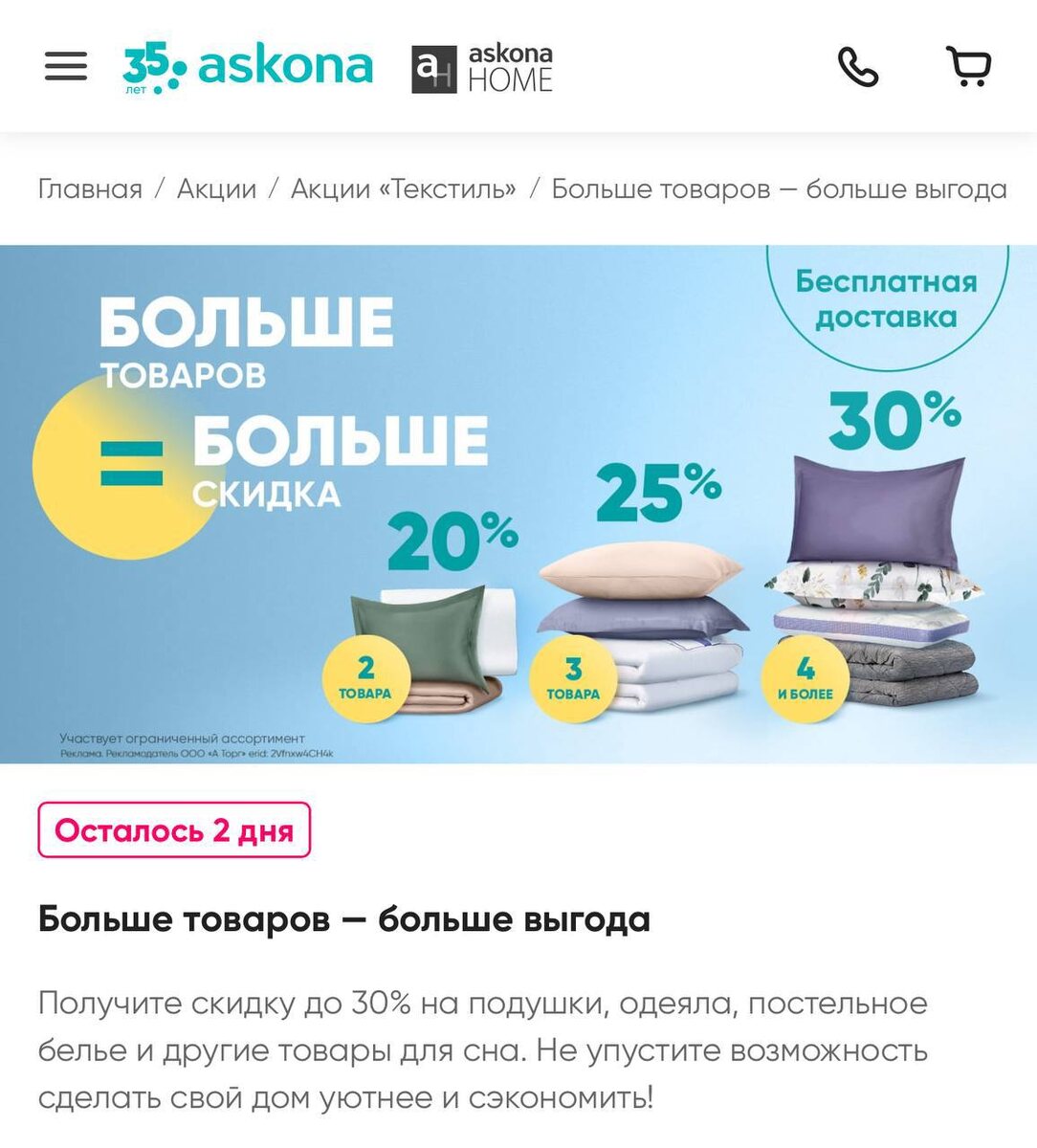 Доброе утро 😃 Классная акция в Askona Покупаем: 2 товара- скидка 20% 3 товара- скидка 25% 4 товара - скидка 30% Подробно по ссылке: https://ya.cc/7q7Kgp Подписаться на канал: https://dzen.ru/id/65f30992106fab2943124639 #покупки #отзывы #экономия #скидки #распродажа #промокоды #ascona