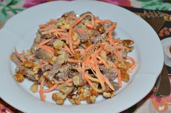 Салат с говяжьим сердцем От автора: Сердце перед варкой нужно подготовить. Первоначально у меня было 800гр сердца. Затем я с него срезала весь жир и осталось уже 650 гр сердца. Затем нужно отварить сердце в воде 2 часа, после которого в итоге остается всего 300гр. Так что нужно правильно рассчитать, сколько нужно купить этого сердца. Ингредиенты: Сердце говяжье - 300 гр. (отварного) Морковь по-корейски - 150 гр. Грибы шампиньоны - 450 гр. Орехи грецкие - 80лук гр. Лук репчатый - 1 шт. (средняя) Соль - 20 гр. (0,5 ст. л.) Майонез - 50 гр. (2 ст. л.) Источник: https://rusdinner.ru/page/salat-s-govyazhim-serdtsem