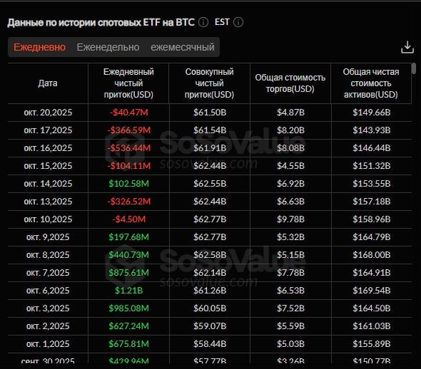 🔸20 октября спотовые биткоин-ETF зафиксировали общий чистый отток в размере $40,47 млн, продлив свою четырехдневную серию вывода средств