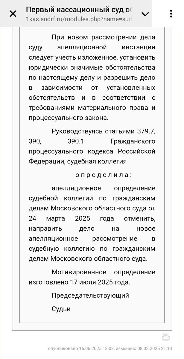 Отменили сначала апелляционное определение Московского областного суда, а затем и решение суда первой инстанции, признали доп соглашение о