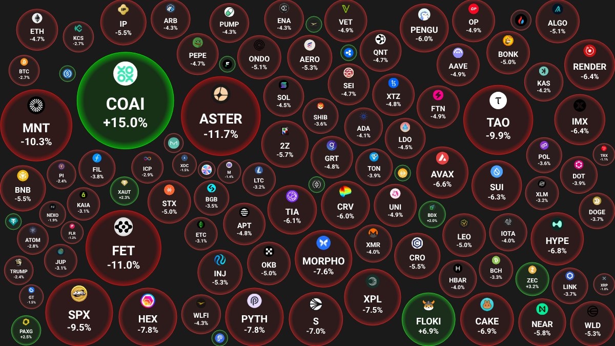 📊 Ежедневный обзор рынка криптовалют от Coinbubbles.ru 🗓 21.10.2025 09:31 по Москве. 🔗 Посмотреть на сайте 📈 Лидеры роста (из ТОП-100): 🟢 ChainOpera AI (COAI): $5.7331 (+15%) 🟢 FLOKI (FLOKI): $0.0001 (+6.9%) 🟢 Zcash (ZEC): $254 (+3.2%) 📉 Лидеры падения (из ТОП-100): 🔴 Aster (ASTER): $1.1002 (-11.7%) 🔴 ASI Alliance (FET): $0.2609 (-11%) 🔴 Mantle (MNT): $1.7467 (-10.3%) 🔍 Основные метрики: 🔴 Общая капитализация: $3653.97 млрд (-3.09%) 🟢 Общий объем торгов: $165.20 млрд (+3.19%) 🟢 Доминация Bitcoin: 58.93% (+0.19%) 🔴 Доминация Ethereum: 12.82% (-0.22%) 🟢 Индекс страха и жадности: 34 / 100: СТРАХ (+5) ⚪️ Индекс Альтсезона: 26 / 100: НЕ АЛЬТКОИН-СЕЗОН (0) 📖 Интересные статьи: 👉 Как избавиться от грязной криптовалюты без потерь. 👉 Скрытые индикаторы крипторынка: метрики, которые помогут опередить толпу 😻 Наши сервисы и бонусы: 👥 VK - наша группа в VK 📈 Bitget - Скидка на торговую комиссию 20%