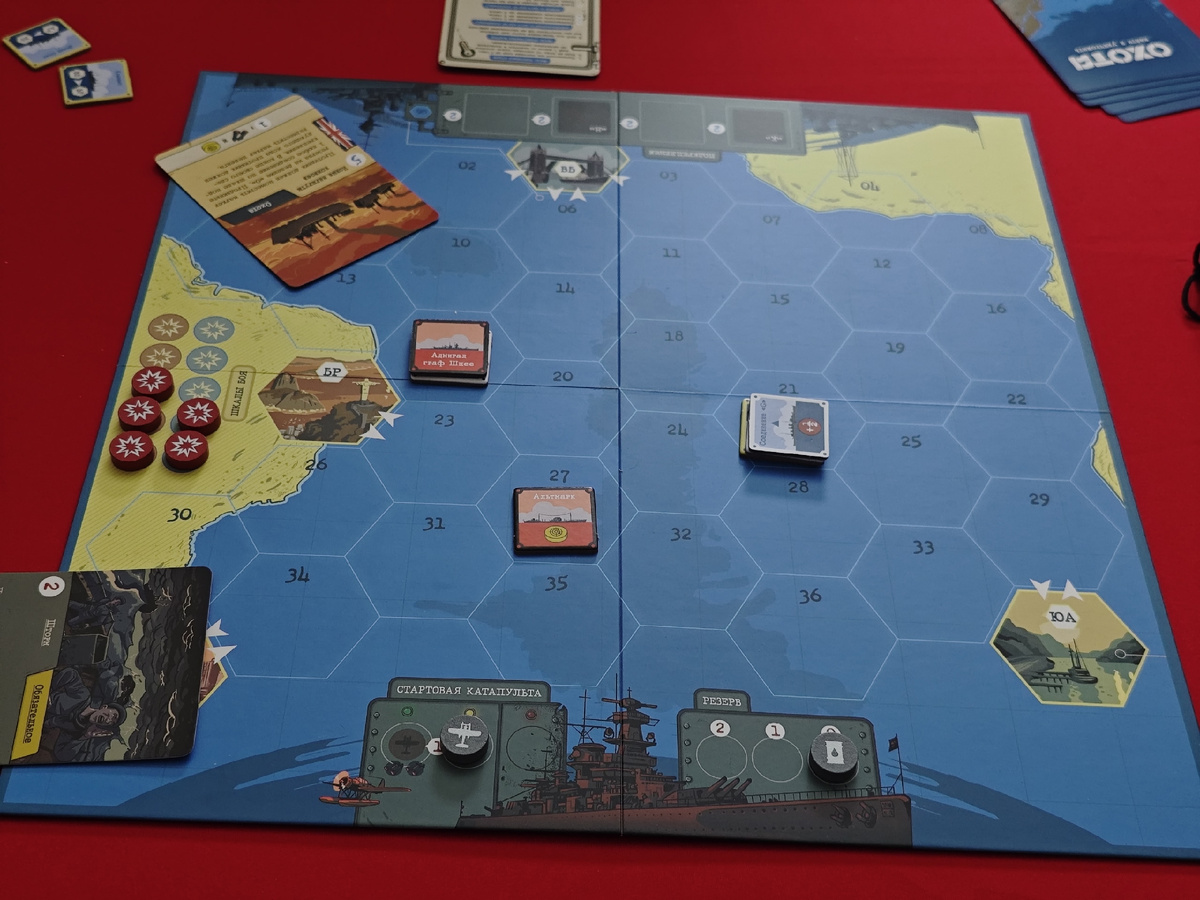 Не поверите, друзья, но на днях получилось пересечься с Вадимом и поиграть в настолочки. Последний раз мы, кажется, в начале августа играли! Сыграли в четыре игры, но чтобы не мучать вас лонгридами, разделю на два поста. Эту игру Вадим хотел попробовать больше всего, поэтому мы начали именно с нее. Я уже писал целый обзор, кто не читал, можете ознакомиться здесь. Вкратце скажу, что один игрок играет за Германию, скрытно передвигая свой корабль и топя торговые суда Британии, а второй игрок берет на себя роль Королевского флота Британии, которому необходимо вычислить местоположение немецкого корабля и победить в решающем бою (либо довести 5 своих судов до пунктов назначения). Я играл за Германию, Вадим за Британию. Поначалу у меня все довольно неплохо складывалось. В первый ход я потопил британское судно. Но потом Вадим буквально зажал меня, высовываться было опасно. К середине игры у нас было по два судна, но у Вадима еще два было на подходе. Я не мог медлить, поэтому решил пойти на ри