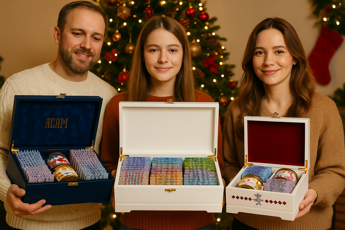 Белая или глубокая синяя поверхность, блеск лака, аккуратная золотистая фурнитура, национальный орнамент — всё продумано так, чтобы с первого взгляда вызывать ощущение заботы и вкуса. Такой подарок не требует дополнительной упаковки — он уже сам по себе выглядит как дорогая деталь.