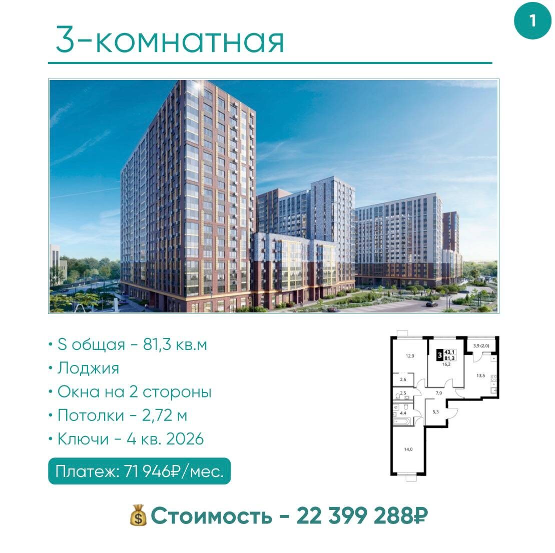 Вы когда-нибудь ловили себя на мысли, что в вашей квартире стало тесно? Когда игрушки на кухне, рабочее место в спальне, а мечта — просто иметь свою комнату для каждого? И знаете, что радует? Сегодня это действительно возможно с семейной ипотекой от 4%: 1️⃣3-к.кв 81,3 кв.м: Стоимость: 22 399 288₽ ПВ 46,4%: 10 399 288₽ Ежемесячный платеж: 71 946₽/мес Ставка: 6% 2️⃣3-к.кв 68,9 кв.м: Стоимость: 15 802 904₽ ПВ 24,1%: 3 802 904₽ Ежемесячный платеж: 71 946₽/мес Ставка: 6% 3️⃣3-к.кв 84 кв.м: Стоимость: 17 306 097₽ ПВ: 5 306 097₽ Ежемесячный платеж: 70 029₽/мес Ставка: 5,75% 4️⃣3-к.кв 66,11 кв.м: Стоимость: 20 160 500₽ ПВ: 8 160 500₽ Ежемесячный платеж: 71 946₽/мес Ставка: 6% 5️⃣3Е-к.кв 55,8 кв.м: Стоимость: 14 487 228₽ ПВ 20,1%: 2 911 932₽ Ежемесячный платеж: 55 263₽/мес Ставка: 4% _______ 🔥Если вы чувствуете, что пришло время для перемен — напишите нам, и мы поможем рассчитать, какая квартира подойдёт именно вам. Мы подберём варианты спокойно, без давления. Сравним, посчитаем и при