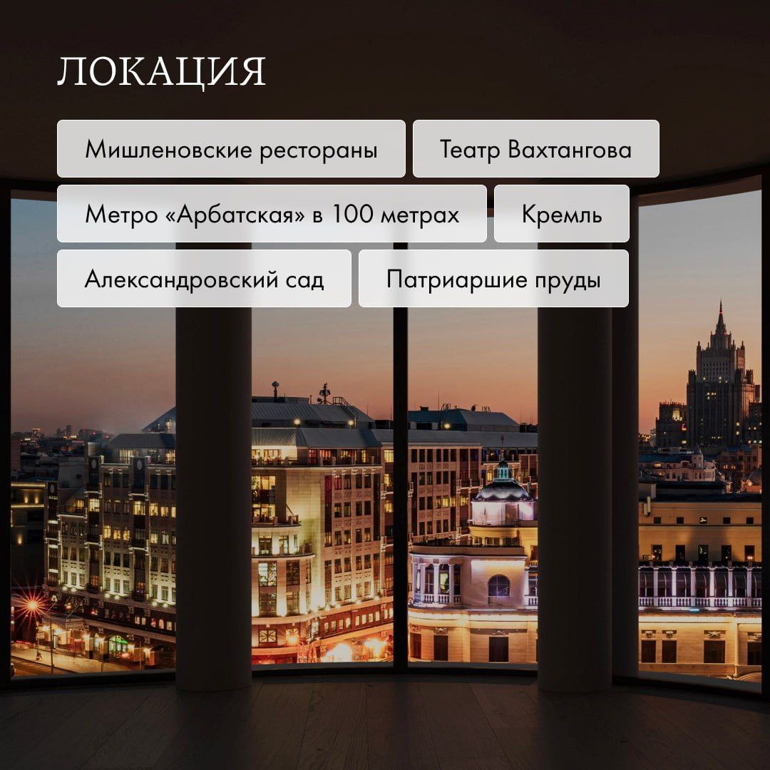 Камерный клубный дом делюкс-класса в сердце Арбата Новый 8-этажный дом на пересечении Арбата и Бульварного кольца, прямо напротив кинотеатра «Художественный». Архитектурным прообразом стал знаковый особняк Арсения Морозова в неомавританском стиле по соседству, чьи узоры расцвели на колоннах «Никитского 6». Это идеальный выбор для: • Ценителей эстетского дизайна. Архитектура от ЦЛП. Все интерьеры оформили в студии Fedorova Architects: отделка из натурального камня и дерева. В продаже всего 61 лот, включая 4 пентхауса, где можно установить дровяной камин. • Семей, ищущих уединение в центре. Внутри – зал в духе античного перистиля, лаунж-библиотека с камином, переговорная комната, зал для йоги и пилатеса, модные бутики на первом этаже и охраняемый зелёный двор. • Тех, кто любит Арбат. Всего 100 метров от метро «Арбатская», 3 минуты на машине до Садового кольца. Рядом – театр Вахтангова, мишленовские рестораны, культовые галереи и музеи, а до Красной площади можно дойти за 20 минут прия