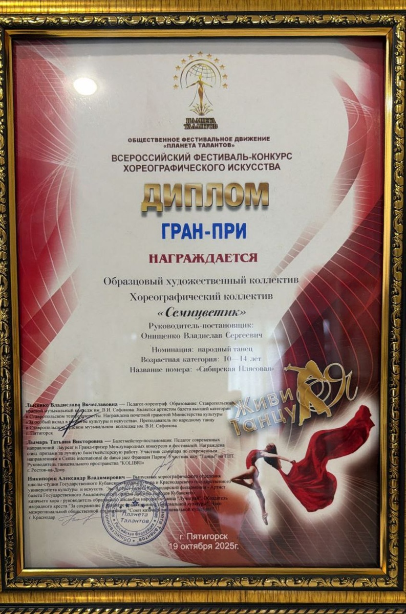 Покорение творческих вершин Пятигорска. 19 октября Образцовый хореографический коллектив "Семицветик " принял участие во Всероссийском фестивале-конкурсе хореографического искусства "Живи танцуя", в г. Пятигорске. Профессиональное жюри высоко оценило выступление нашего коллектива, из 75 концертных номеров коллективов из разных городов "Семицветик" завоевал 6 мест Лауреата 1 степени и главный приз Гран При за постановку номера "Сибирская плясовая" Гордимся и поздравляем детей, родителей и руководителя Онищенко Владислава с достойной победой! 🏆 #ЦНКИстоки #КультураСочи #ЖивиТанцуя