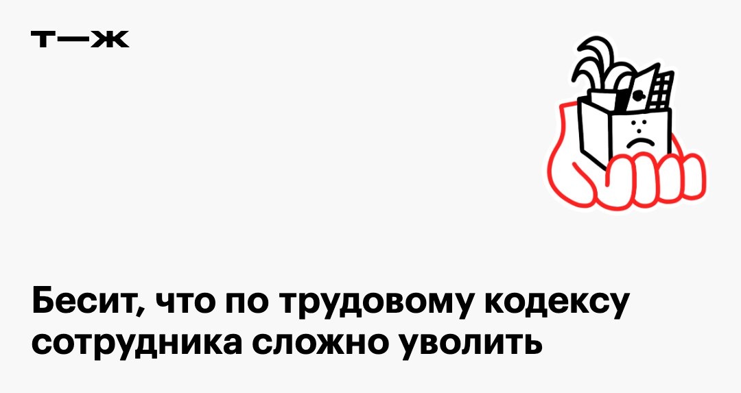 Бесит, что закон не позволяет уволить сотрудника, если он мне не нравится или с ним трудно. Я понимаю, что есть права, ответственность и прочее. Но почему я должен держать в компании человека, трудиться с которым мне стало неприятно? Да и по ряду причин он меня не устраивает как профессионал. В очередной раз убеждаюсь, что нанимать работников официально — это лишние проблемы и заботы. 😡 Читателя раздражает, что от неподходящих сотрудников слишком сложно избавиться на законных основаниях. Согласны? 🔥 — и правда, от трудового кодекса сплошные проблемы 👀 — а давайте лучше уволим начальника Приходите подискутировать: https://t-j.ru/tg/ne-mogu-uvolit-sotrudnika-hate/