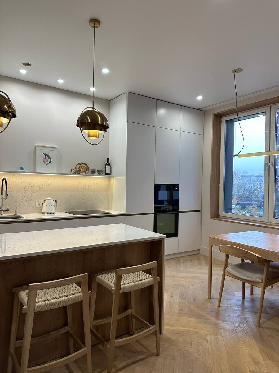 Кухня без ощущения кухни🪄 Именно такое желание было у нашей заказчицы Анны, когда она занималась проектированием своего будущего интерьера. И именно поэтому было принято решение отказаться от части навесных шкафов👌🏻 Поменещение 17 м2 вместило в себя 3 функциональные зоны - кухня, остров и обеденный стол🍽️ Детали: ▪️Материал: МДФ-эмаль (Брэд, Брэд Интегра 1, 2), ЛДСП (остров) ▪️Цвет: NCS S 1000 N (25%), RAL 1036 (25%), NCS S 1002 Y50R (25%) ▪️Размеры: 3871мм, 1950мм - остров, 600мм - пенал ▪️Высота: 2880мм, 900мм - остров ▪️Ящики BLUM ANTARO ▪️Петли Blum с доводчиком ▪️Бутылочница ▪️Стоимость: 782 735 ₽ Менеджер: Капустина Александра Дизайнер: Воинова Нина @dsgnhubinterior Дата заказа: 30 января 2024 г. Как вам кажется, удалось достичь легкости на этой кухне❓