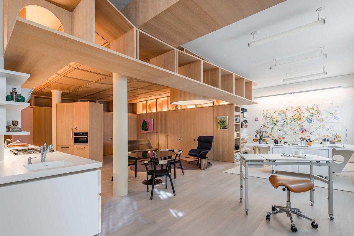 В классическом металлическом здании Нью-Йорка переплетены три типа пространств: рабочая студия, галерея и жилое пространство. Заказчик, художник, заказал капитальный ремонт заброшенного чердака прямо над «Земляной комнатой Диа» Уолтера Де Марии (Walter De Maria). Расположенное в одном из первых кооперативов Fluxhouse, это место стало генератором трансформации Сохо 1970-х годов из складского в художественный район. Этот проект начался в студии Дайан Льюис (Diane Lewis), где Эмма Фуллер (Emma Fuller) была ведущим дизайнером и помощником. После преждевременной смерти Дайаны компания Fuller/Overby Architecture продолжила и завершила проектные работы и курировала строительство. В этой реконструкции столярная конструкция вставлена в структурный каркас XIX века. Проект разворачивается вокруг централизованного кессонного пространства, разбитого на отдельные программные зоны, каждая из которых адаптирована к условиям площадки и практическим требованиям. Студия окружена оконным фасадом, внутре