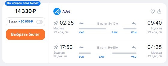 ✈️Москва - Эрджан (Северный Кипр), туда и обратно с пересадками в Стамбуле, за 14350 рублей 29 ноября - 12 декабря - https://checkintime.ru/7x5m 🏖 Поиск туров | ✈️Авиабилеты