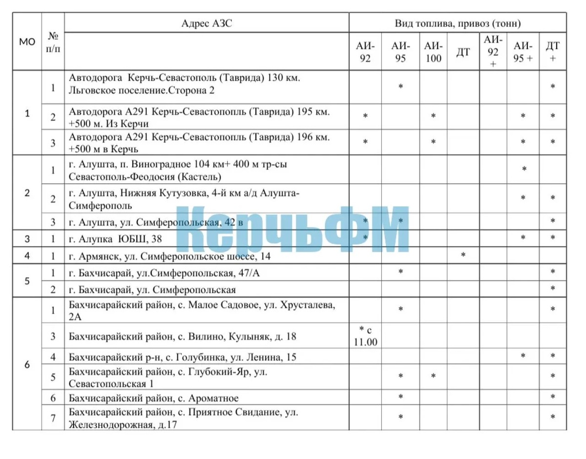 Где сегодня в Крыму можно заправиться Перечень адресов крымских АЗС, где имеется топливо в свободной продаже. Поставки ведутся по распоряжению Министерства топлива и энергетики Республики Крым. Информация обновляется ежедневно, передает КерчьФМ. Актуальные данные о наличии топлива на АЗС Республики Крым размещены на портале Минтопэнерго Крыма по ссылке« target=«_blank« rel=«noopener external«>https://mtop.rk.gov.ru/structure/d0efbb41-ebd3-4509-8ea1-e00ba1b9bffe)... подробнее Подписывайся на КерчьФМ.РФ @kerchfm