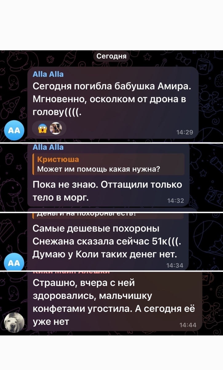 Сегодня ночью в Алешках опять был обстрел. Люди лишились домов и есть жертвы. Погибла бабушка Амира, того самого мальчика, которому мы передавали смартфон, книги, инструменты... Мальчика должен забрать дядя и увезти. На похороны бабушки денег у людей нет. А цены... Нет слов.... Пострадала и волонтёр, которая собакам и кошкам. Женщина стала заложницей своего доброго сердца. Она не может уехать пока не вывезут животных На днях планируется поездка туда, но в сами Алешки попасть уже невозможно. Машина доедет только до Каланчака, дальше уже дроны и слишком опасно... Сейчас мы срочно собираем гуманитарную помощь людям и животным. Ехать пустой машиной совесть не позволяет. Ситуация в Алешках максимально ухудшилась. Мы уже не знаем, что писать, как описать тот ад, какие видео приложить и какими словами умолять помочь тем, кто там выживает. Но если у вас есть малейшая возможность помочь, сделайте это, пожалуйста. ** *** *** Назначение - "Добровольное пожертвование" СБП +7 (978)