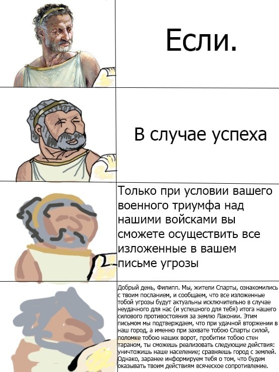 Знали историю мема?) На угрозу Филиппа (который батюшка Александра Македонского): "Если я вторгнусь в Спарту, я вас изгоню", спартанцы ответили: "Если". Спартанцы вообще были весёлые ребята (как нам докладывают античные рассказчики). Здесь собрал для вас немного лакедемонской премудрости⬇️ Когда кто-то выразил неудовольствие, что Леотихид Первый часто меняет свои решения, царь сказал: «Я-то меняю по обстоятельствам, а вы — вследствие подлости». Видя, что беотийцы никак не могут решить, пропускать ли войско Лисандра через свою страну или нет, он послал спросить у них, должен ли он продвигаться держа копья вертикально или наперевес. Когда оратор, растянувший свою речь надолго, потребовал ответа, чтобы передать его своим согражданам, спартанцы сказали: «Передай им, что ты еле-еле закончил речь, а мы едва дослушали». Кто-то, рассматривая картину, где были нарисованы афиняне, убивающие спартанцев, воскликнул: «Однако эти афиняне храбрецы!» Спартанец, перебив его, добавил: «На картине»