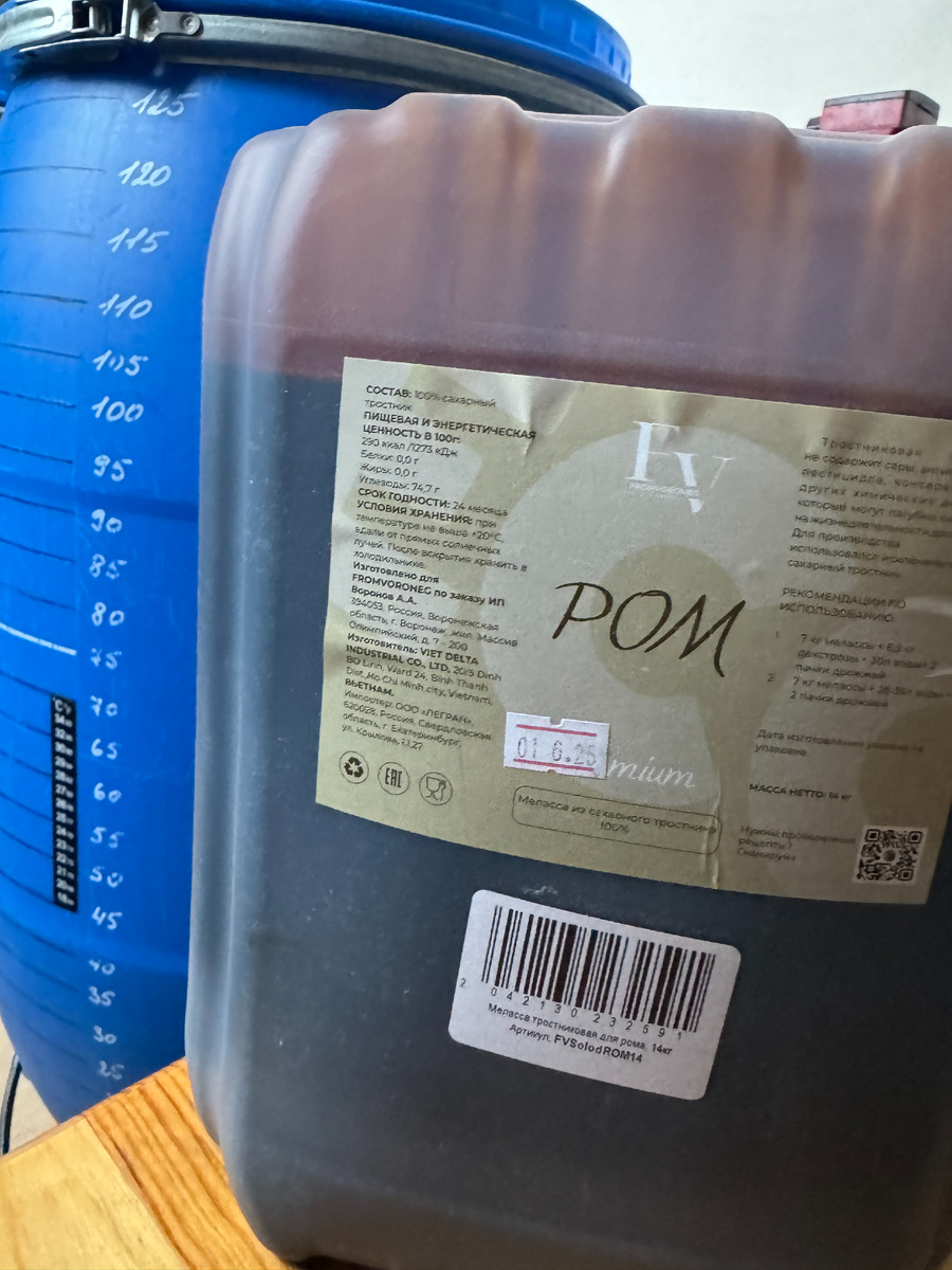 Взял 4 шт. х14кг. на 30л. бочонок. Аккурат предыдущий снимать пора. Вьетнамская вполне устраивает. От этого производителя в первые. Изготовитель VIET DELTA Industrial CO. LTD Вьетнам. Продавец FROMVORONE: Контрольное разведение 1:10 сахар 10,6 Brix, приблизительно 52-55% по сахару. Шмурдяка не выявлено, да мутная. но не расслаивается. Для бочки делаю соотношение 14/9 меласса/декстроза. Общий объем сусла 75-85 литров. Две первые 80 литров общий объем НПС 24 и 25 – очень неплохо. Запах при разведении мелассы, плотный и вкусный. Дрожжи Alcotek RUM turbo по 2 пачки без регидрации, старт более 12 часов. На брожении запаха мелассы много, приятный. Активное брожение дня 4, на пятый день уже молчали. Остаточный сахар 4,8% - многовато будет. Отправил на неделю осветлятся к батарее Две вторые пошли в соотношении 14/8, общий объем 80 литров НПС 22 и 22,5 Brix. Дрожжи Alcotek RUM turbo по 1 пачки сухими, + по 1 пачке с регидрацией, легко задышали через 4 часа. Отработали за 4 дня, спустя 2 недели