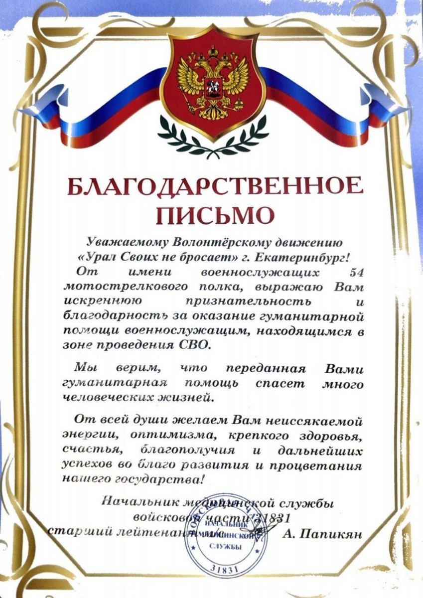 Добрый вечер, дорогие друзья! Наша группа получила благодарственное письмо от медицинской роты 54 полка. Мы искренне рады, что можем поддержать тех, кто ежедневно трудится на благо здоровья наших бойцов! Спасибо каждому, кто принимает участие в нашей работе, будь то пожертвования, волонтёрская помощь или моральная поддержка. Это благодарственное письмо всем вам 🙏❤️ Вместе мы огромная сила 💪🇷🇺 #уралсвоихнебросает #медицинская_рота #победабудетзанами