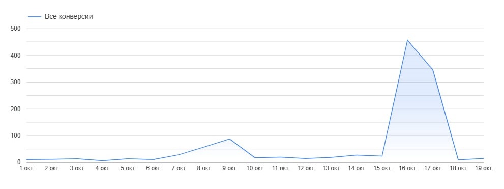Горьким опытом научены, что не может быть всё так хорошо. Иду разбираться. Обнаруживаю резкий всплеск конверсий ровно на 2 дня и всё. Далее снова подорожание. Атака ботов?!? Лезу в Метрику. Нет, трафик вроде бы от людей.
