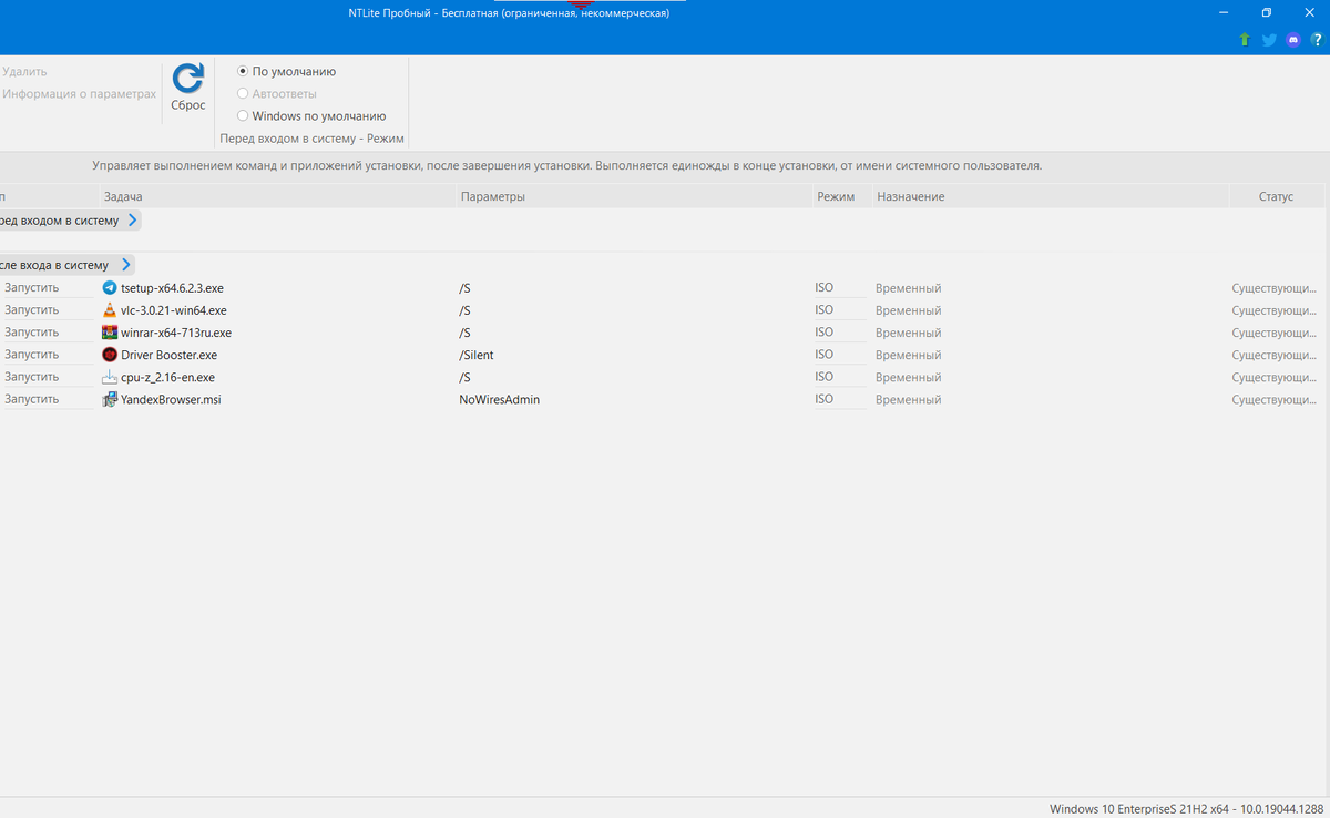 Давно хотел собрать свою кастомную Windows, где нет телеметрии, рекламы и “Microsoft Edge, который нельзя удалить”. Чтобы при установке всё ставилось само — без 100 кликов “далее”, и сразу были нужные программы. NTLite - это инструмент для кастомизации Windows. С ним можно: убрать любые системные компоненты (Defender, Cortana, UWP-приложения, Edge) (но не прям все ))) интегрировать драйверы, обновления, Visual C++ и .NET добавить свои программы прямо в ISO настроить автоустановку сразу включить нужные параметры (службы, производительность, конфиденциальность) Проще говоря - ты берёшь чистый образ Windows, настраиваешь его “под себя”, и получаешь готовую систему, которая ставится ровно так, как тебе надо. Что я сделал Взял чистую Windows 10 LTSC Вычистил всё лишнее Добавил набор утилит, которые реально нужны админу Встроил свои настройки и тему Сделал автоустановку без вопросов “введите имя пользователя” Результат после установки - лёгкая, чистая, быстрая Windows. Никаких “приложений