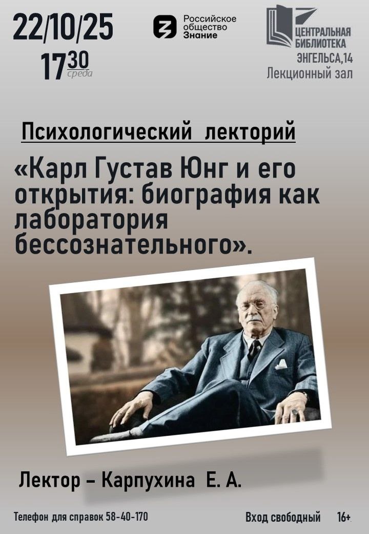 🧠22 октября в 17:30 в Центральной библиотеке в Обнинске пройдёт психологический лекторий — лекция о Карле Густаве Юнге и его открытиях