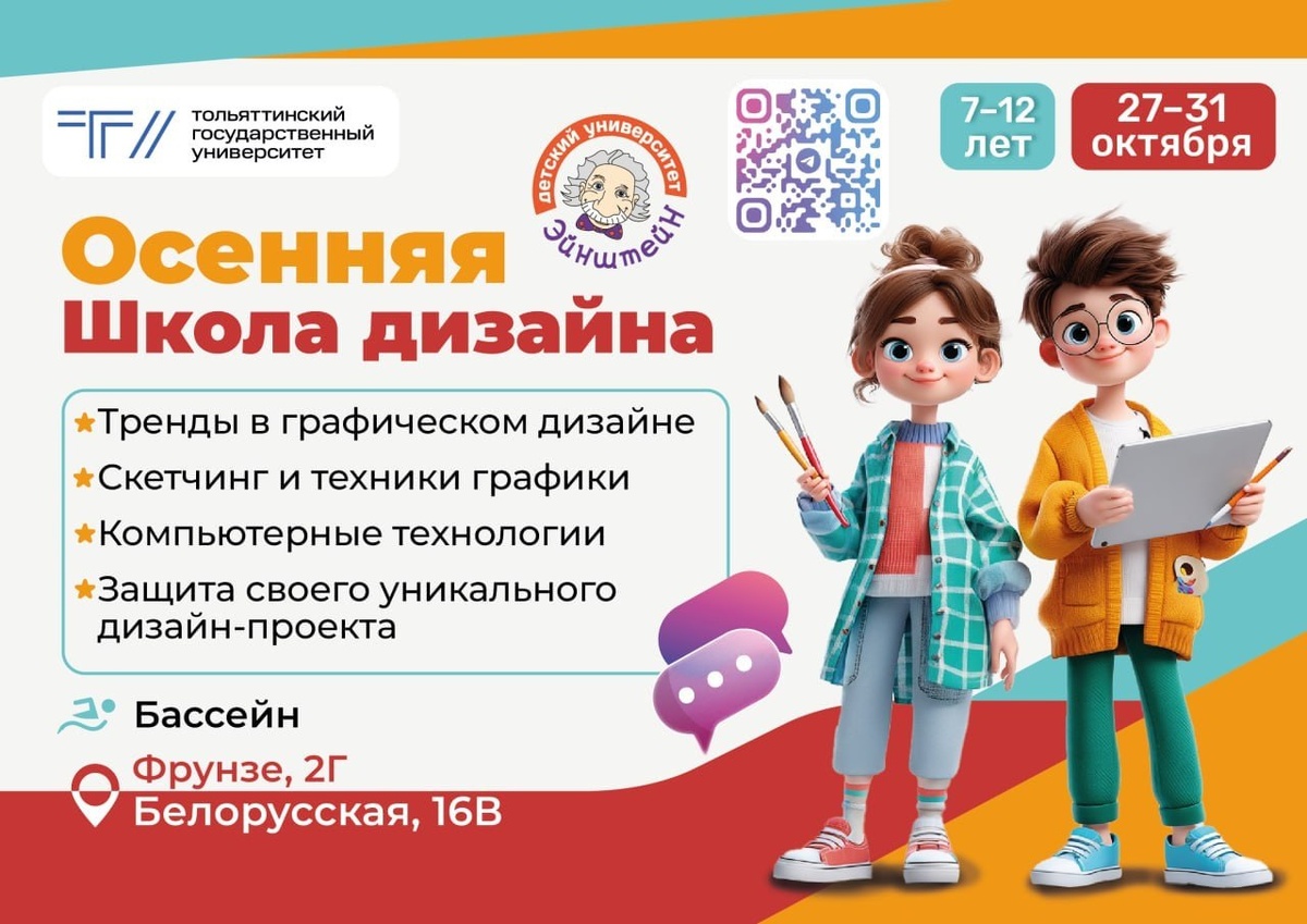 🍂 Осенние каникулы – время, когда хочется, чтобы ребёнок отдохнул от школы, но не проводил дни за гаджетами. Как это сделать? VIII Школа Эйнштейнов приглашает на осеннюю смену школьников 7-12 лет! В этом году участники смогут выбрать один из двух треков: «Альфа-предприниматель» и «Школа Дизайна». 📈 Альфа-предприниматель Поможем вашему ребёнку сделать первый шаг к своему стартапу! – Проведём практику с «Альфа-Банком»; – Изучим экономику, финансы, маркетинг и PR; – Презентация своего стартапа перед «инвесторами». 🎨 Школа Дизайна Раскроем творческий потенциал и научим работать с современными трендами! – Изучим тренды в графическом дизайне, скетчинг, технику графики и компьютерные технологии; – Защита своего уникального дизайн-проекта! Обучение пройдет на двух площадках: в Автозаводском районе (ул. Фрунзе, 2Г) и в Центральном районе (ул. Белорусская, 16В). Программа рассчитана на полный день с 9:00 до 17:00. В стоимость входят обед и полдник, а также посещение бассейна. Оставьте