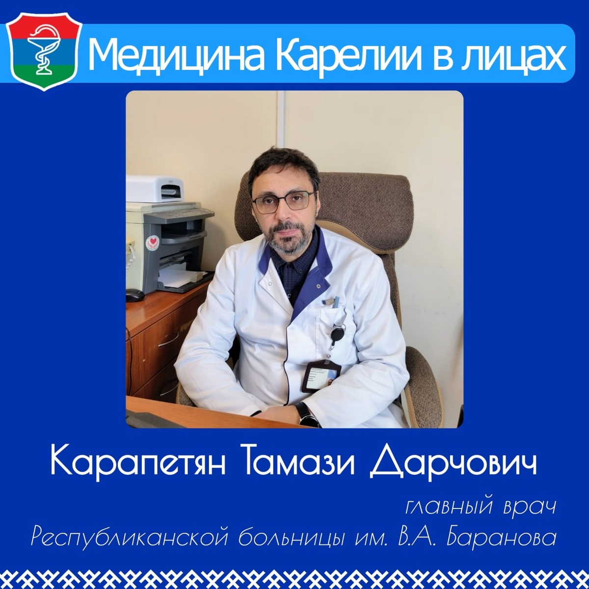 Ровно пять лет исполняется нашему проекту «Медицина Карелии в лицах». В этой рубрике мы уже рассказали почти о 200 врачах, медицинских сестрах, фельдшерах, санитарках, водителях спецтранспорта и других работниках медицинских организаций республики. Новый герой нашей рубрики – заслуженный врач Республики Карелия Тамази Карапетян. После окончания медицинского факультета ПетрГУ он прошёл путь от врача-терапевта Республиканской больницы им. В.А. Баранова до главного врача этого крупнейшего учреждения здравоохранения Карелии. 👏 Благодаря Тамази Дарчовичу в коллективе РБ имени В.А. Баранова царит атмосфера взаимного уважения, сотрудничества и командного духа. Как современный руководитель, имеющий клинический опыт, он глубоко вникает в суть ежедневных проблем в каждом подразделении больницы, видит долгосрочную перспективу развития отделений, прислушивается к мнению коллег и чаяниям пациентов. В РБ приобретают новое современное оборудование, внедряют новые высокотехнологичные методы лечения