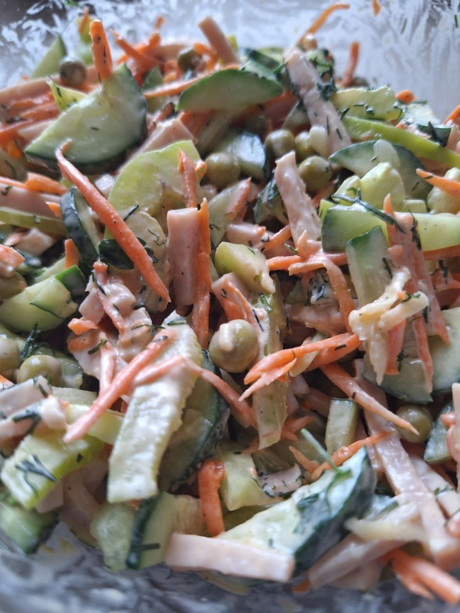 Колбасу, огурцы, болгарский перец и морковку нарезать на полосочки или на брусочки. Все выложить в мисочку и добавить остальные ингредиенты, хорошо перемешать и можно выкладывать на блюдо.