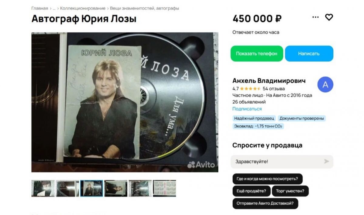 В Воронежской области решили продать автограф известного певца и композитора Юрия Лозы. Его стоимость возросла более чем на 15%. Обновленная цена на популярной платформе объявлений «Авито» была установлена 8 октября, спустя месяц после начала торгов. По данным наших коллег из издания De Facto, изначально лот оценивался в 390 тысяч рублей. Теперь владелец уникального календаря с автографом Юрия Лозы, проживающий в Россоши, готов продать его вместе с CD-диском альбома «Для ума…» за 450 тысяч рублей. Напомним, что год назад Юрий Лоза выразил недовольство по поводу памятника Джону Леннону, установленного в Воронеже. Музыкант назвал его автора «инициативным битломаном», который предпочитает проводить ночи на скамейке с алкоголем.