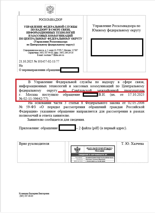 Февраль-март 2025: Я жалуюсь в Генпрокуратуру на МТС, который не присылает уведомления. Затем - на бездействие самой прокуратуры. Ответа нет 7 МЕСЯЦЕВ. Май 2025: В отчаянии пишу депутату Госдумы Сергею Миронову. Депутатский запрос в Генпрокуратуру - И ЕГО ИГНОРИРУЮТ. Сентябрь 2025: МТС, чувствуя безнаказанность, снова меня отключает. Я ночью остаюсь без интернета. Пишу новую жалобу в Генпрокуратуру на всех. И начинается «футбол»: Генпрокуратура → Прокуратура Москвы → Савеловская межрайонная прокуратура → и, внимание... РОСКОМНАДЗОР. Да-да, мою жалобу НА ПРОКУРАТУРУ отправили в Рос