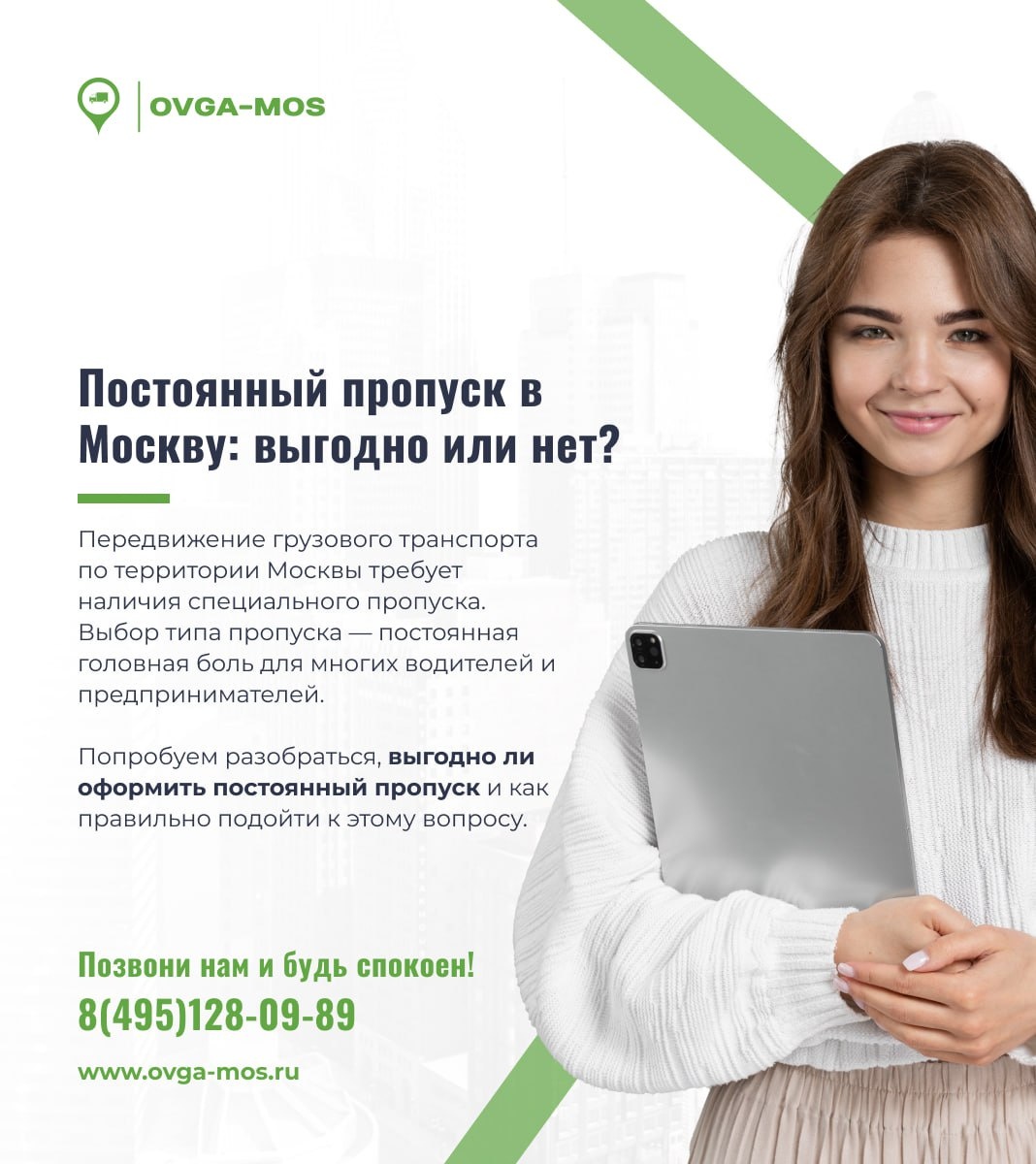 Передвижение грузового транспорта по территории Москвы требует наличия специального пропуска. Выбор типа пропуска — постоянная головная боль для многих водителей и предпринимателей. Попробуем разобраться, выгодно ли оформить постоянный пропуск и как правильно подойти к этому вопросу. Постоянный пропуск — это документ, который дает право на передвижение грузового транспорта массой более 1 тонн по территории Москвы в течение целого года. Он позволяет свободно передвигаться по МКАД, ТТК и Садовому кольцу без ограничений. Если вы регулярно осуществляете перевозки в Москве, постоянный пропуск — это оптимальное решение. Оформление временных пропусков может оказаться дороже и хлопотнее, а штрафы за отсутствие пропуска сделают переезд невыгодным. Компания ОВГА-МОС предлагает удобные и доступные услуги по оформлению постоянных пропусков в Москву. Вот почему стоит выбрать нас: - Быстрое оформление: минимальная бюрократия и быстрый процесс оформления. - Консультации и поддержка: наши спе