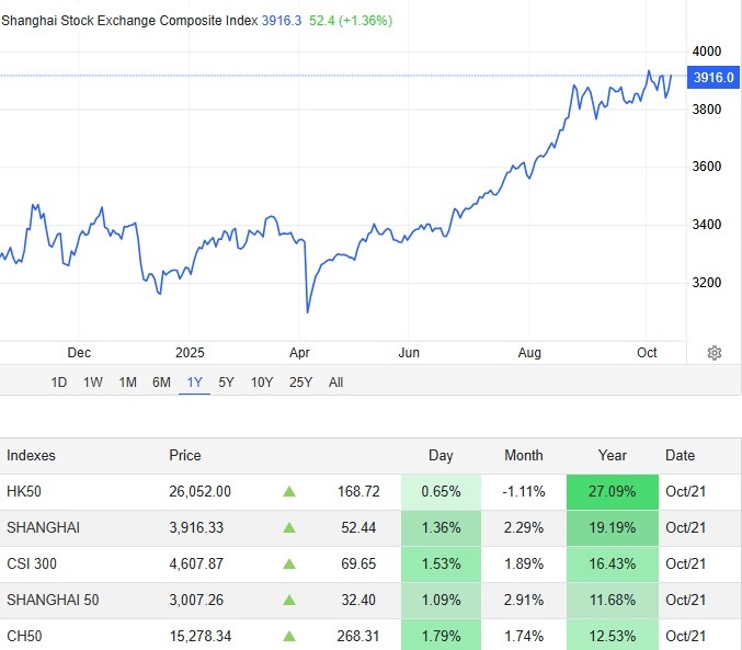 Китайский индекс Shanghai Composite вырос на 1,41%, закрывшись на отметке 3918, Shenzhen Component поднялся на 2,06%, достигнув 13 077 пунктов. Отметим, что индексы материкового Китая растут вторую сессию подряд. Mind Money: «Напомним, Дональд Трамп заявил, что рассчитывает на заключение справедливого торгового соглашения с председателем КНР Си Цзиньпином в Южной Корее в конце этого месяца. Но прежде – на этой неделе - проблемные вопросы обсудят представители обеих стран в Малайзии». Кстати, акции Foxconn Industrial подскочили на 9,6% после того, как Apple объявила о высоких продажах iPhone 17 как в США, так и в Китае.