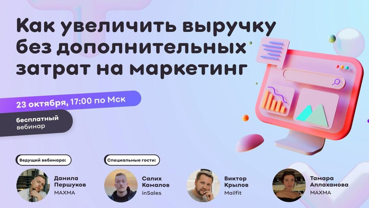 ▶️ Вебинар: как увеличить выручку без дополнительных затрат на маркетинг? inSales, MAXMA и MailFit проведут вебинар о том, как сайт и программа лояльности помогают выстраивать доверие с клиентами, объединять онлайн и офлайн, а также увеличивать выручку. ⭐️ Своим опытом поделятся: • Салих Камалов, ведущий менеджер по интернет-маркетингу inSales; • Крылов Виктор, эксперт из MailFit, директор по продукту Билайн; • Тамара Аллаханова, CRM-маркетолог MAXMA. ⚡️ Обсудим: • тренды e-commerce и роль сайта как точки роста продаж; • как быстро создать сайт и добавить инструменты для повышения лояльности клиентов; • как объединить онлайн и офлайн в единую систему лояльности; • кейсы, где программы лояльности и удобный сайт помогли увеличить выручку. Присоединяйтесь, чтобы задать вопросы и рассказать о вашем кейсе: 🕔 23 октября в 17:00 по мск 💰 бесплатно Зарегистрироваться можно здесь.