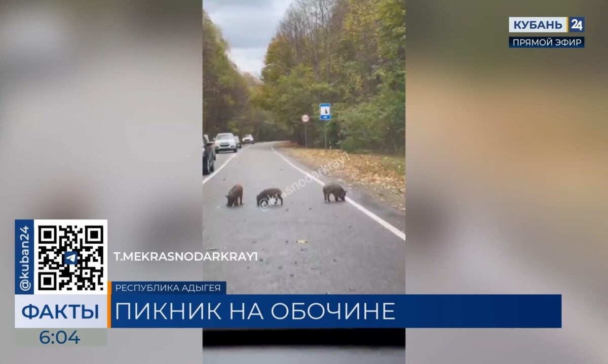 В соцсетях опубликовали видео, как стадо кабанов с детенышами вышли на дорогу в районе Лаго-Наки.