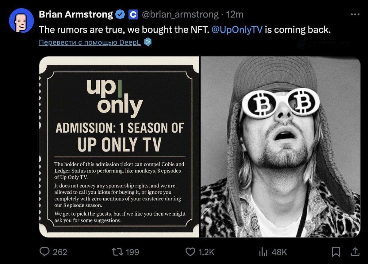 😳 Компания Coinbase задонатила $25,000,000 двум блогерам, чтобы они вернулись в эфир… Куплен NFT «UPONLY» - можно сказать, что это контракт, который обязывает Cobie и Ledger (ведущих) возродить шоу UpOnly минимум на 8 эпизодов, если покупатель его сожжёт.